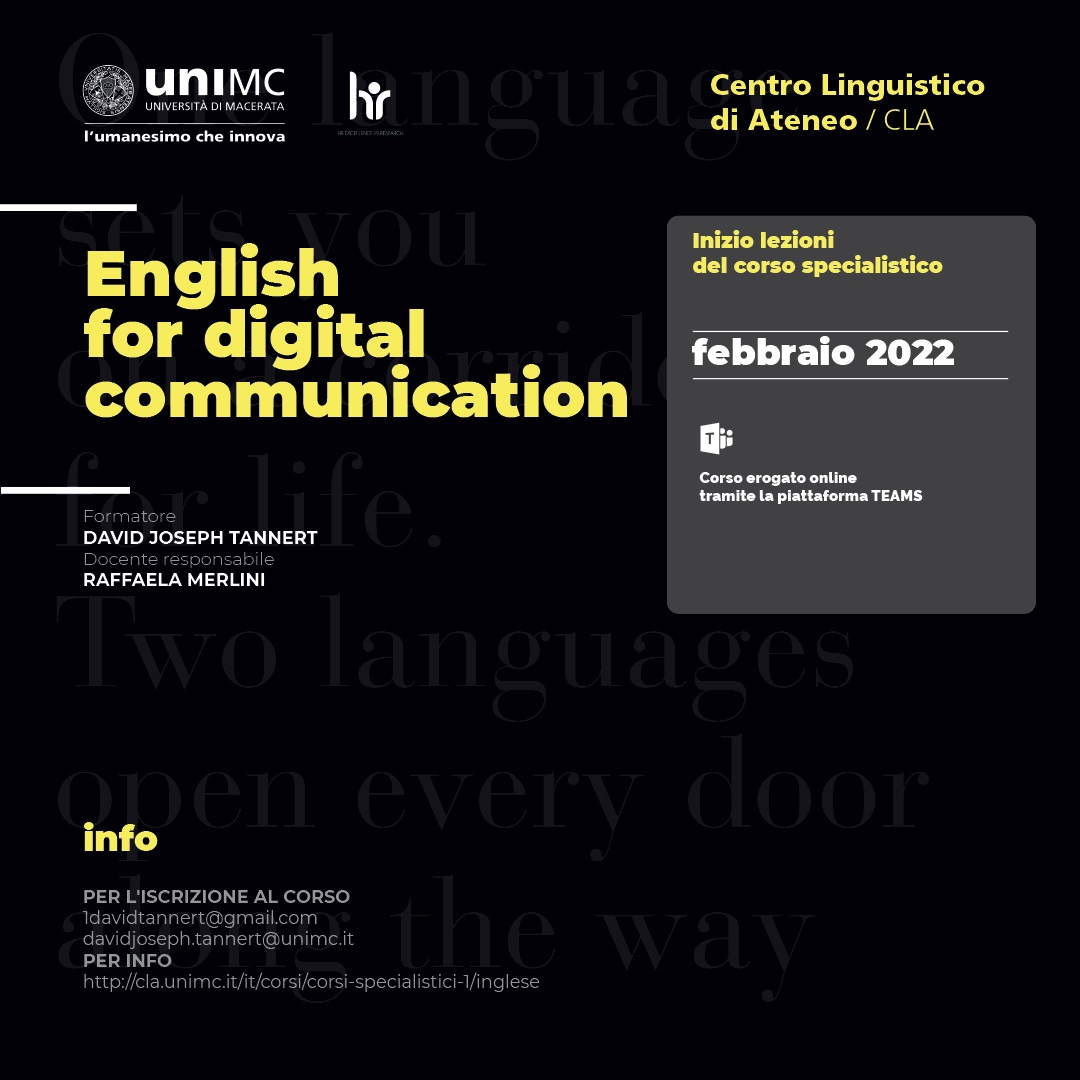 Contenuti del corso "English for digital communication": Il corso mira a consolidare le competenze di comprensione e produzione testuale in lingua inglese presentando agli studenti una selezione di generi testuali (e-mail, blog, tag) concepiti per la fruizione digitale, inclusa quella che caratterizza le piattaforme di social network. Durante le esercitazioni particolare attenzione sarà rivolta, oltre che alla correttezza linguistica, anche alle norme di redazione richieste dalla natura del mezzo elettronico e dalla particolare commistione tra scritto e parlato che si traduce in forme espressive ibride.