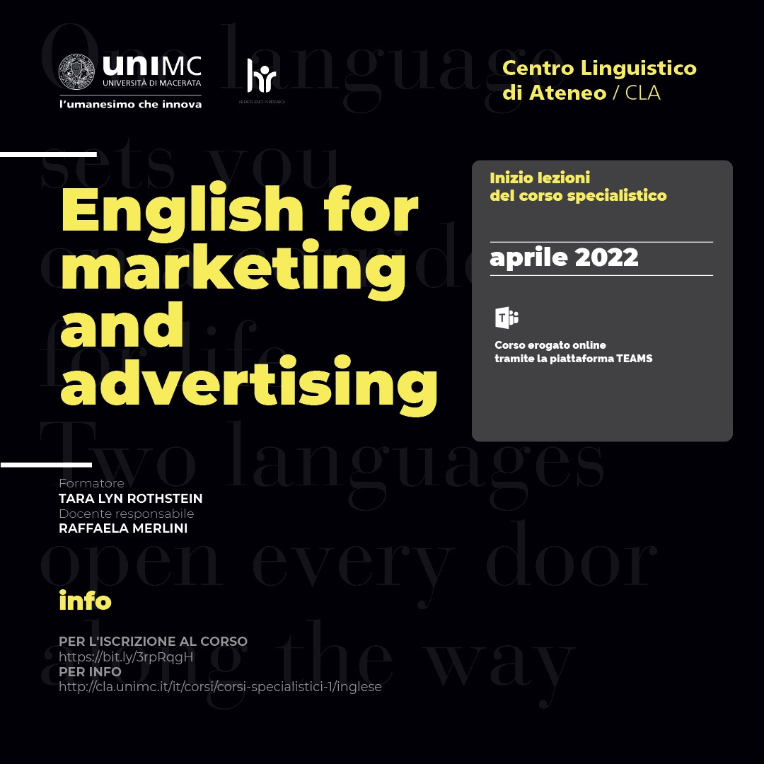 Contenuti del corso "English for marketing and advertising": Il corso mira a consolidare le competenze di comprensione e produzione testuale in lingua inglese presentando agli studenti una selezione di generi testuali di natura promozionale, attinenti sia alla commercializzazione elettronica di prodotti sia all’offerta di servizi turistici disponibile sui siti Internet dei vari enti, italiani e stranieri, che si occupano della valorizzazione del territorio. Durante le esercitazioni particolare attenzione sarà rivolta, oltre che alla correttezza linguistica, anche alle norme di redazione richieste dalla natura multimodale del mezzo di comunicazione e dalla conseguente interazione tra risorse semiotiche differenti.