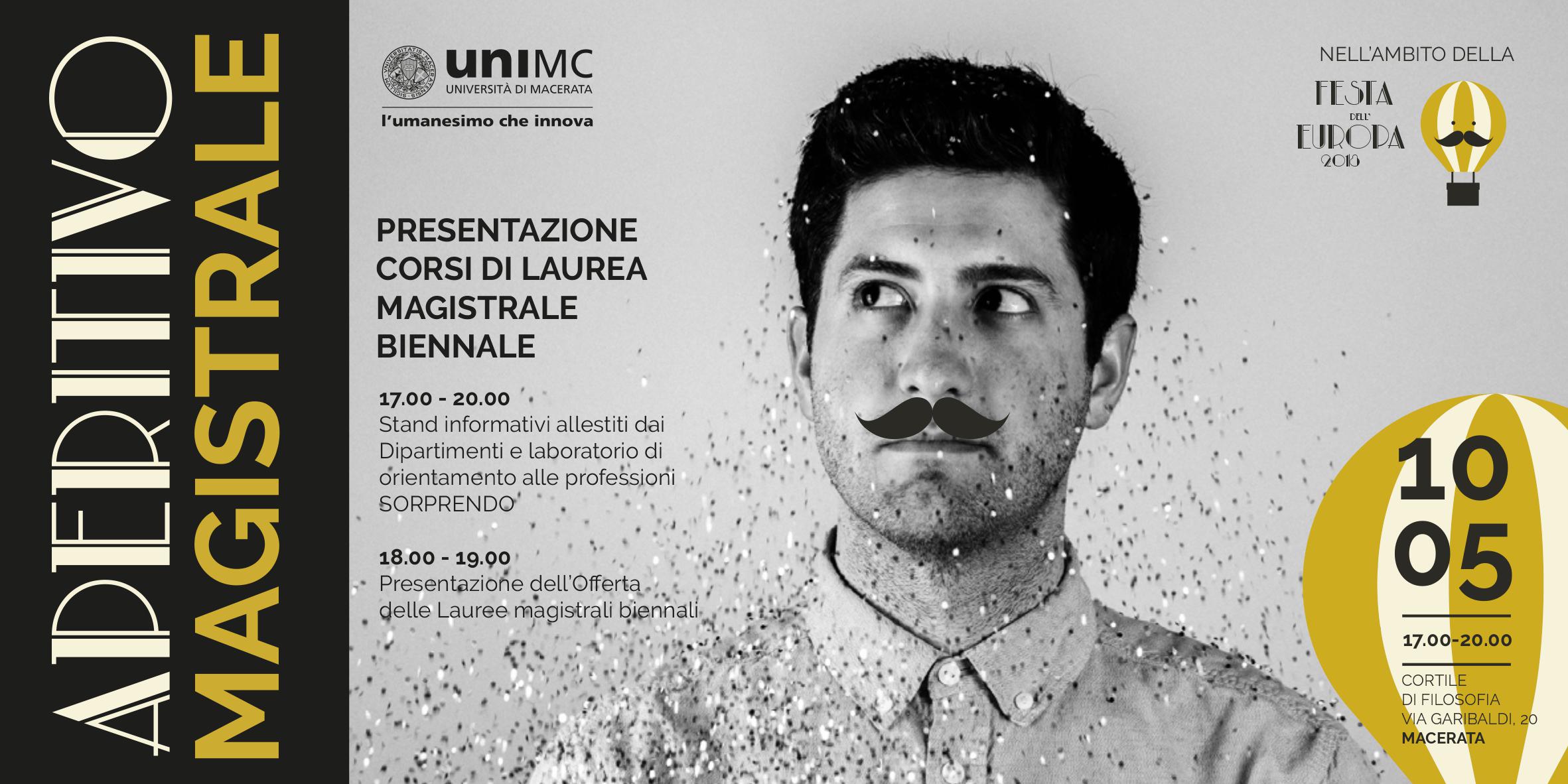 Nell'ambito della Festa dell'Europa 2018 l'Università di Macerata è pronta ad offrirvi un APERITIVO MAGISTRALE giovedì 10 maggio dalle 17:00 alle 20:00 nel cortile di Filosofia (vicolo Illuminati, traversa di via Garibaldi 20).